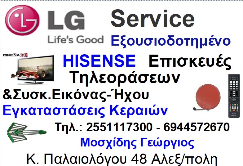 -Ηλεκτρονικός Εξουσιοδοτημένος Τεχνικός- Επισκευές τηλεοράσεων LCD LED PLASMA Smart TVκαι ηλεκτρονικών συσκευών εικόνας-ήχου DVD, Hi-Fi, Home Sinema- LG, Samsung, Sony, Philips, Panasonic, Hisense, HITACHI, Toshiba, Sharp, JVC- Εγκαταστάσεις κεραιών- Εξουσιοδοτημένο LG Service και Hisense Αλεξανδρούπολης Έβρου- Αποκωδικοποιητές MPEG4 DVB-S2 & DVB-T2/DVB-C- Τηλεχειριστήρια