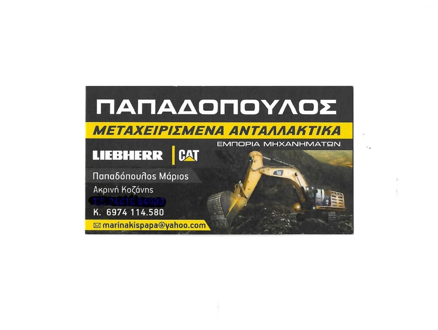 Η εταιρεία Παπαδόπουλος Μάριος εμπορεύεται και διαθέτει προς πώληση μια μεγάλη γκάμα χωματουργικών μηχανημάτων, μηχανημάτων έργου και μεταχειρισμένων ανταλλακτικών για αυτά. Έχουμε την δυνατότητα να εξυπηρετήσουμε την Κοζάνη, την Μακεδονία, ολόκληρη την Ελλάδα αλλά και περιοχές του εξωτερικού κατόπιν συνεννόησης.
