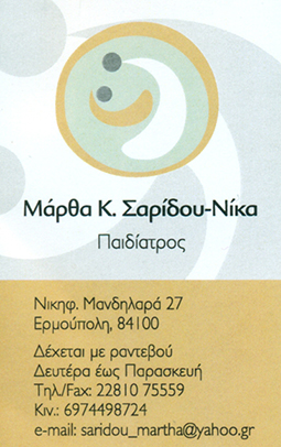 Η Παιδίατρος Σαρίδου Μάρθα είναι ελευθεροεπαγγελματίας Παιδίατρος με έδρα της Ερμούπολητης Σύρου απο τον Αύγουστο του 2013. Ξεκίνησε την ειδίκευση της στην Παιδιατρική στοΝοσοκομείο Ειδικών Παθήσεων (Λοιμωδών) Θεσ/κης όπου για 2 χρόνια εκπαιδεύτηκε στιςλοιμώξεις, (αναπνευστικού, γαστρεντερικού, ουροποιητικού, Κεντρικού Νευρικού Συστήματος).Ολοκλήρωσε την ειδίκευση της στην Δ΄Παιδιατρική Κλινική του Νοσοκομείου ΠαπαγεωργίουΘεσ/κης όπου εκπαιδεύτηκε στα ειδικά γνωστικά αντικείμενα της Παιδιατρικής καθώς και στηνεογνολογία (Β' ΜΕΝΝ).Μέχρι την ολοκλήρωση της ειδικότητας της εργάστηκε ως ιατρός σε διάφορες έμμισθες θέσεις(Κ.Α.Π.Η Δήμου Διδυμοτείχου, Ο.Π.Α.Δ Δήμου Αλεξανδρούπολης, Ιαματικά Λουτρά Τραϊανούπολης).Είναι κάτοχος πιστοποιητικού APLS (εξειδικευμένη υποστήριξη ζωής για παιδιά) και μεταπτυχιακήφοιτήτρια στο Τμήμα Διοίκησης Μονάδων Υγείας του Ελληνικού Ανοικτού Πανεπιστημίου.Είναι παντρεμένη με τον Μαιευτήρα Γυναικολόγο Νίκα Ιωάννη και έχει 2 κόρες.