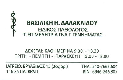 Δέχεται καθημερινά 09:30 - 13:30 και Τρίτη, Πέμπτη, Παρασκευή 16:00 -18:00 κατόπιν ραντεβού. Τ. Επιμελήτρια ΓΝΑ Γ. Γεννηματάς.