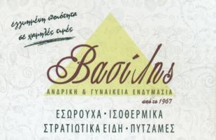 Το κατάστημα ΒΑΣΙΛΗΣ εδρεύει από το 1967 στη Νέα Ιωνία και εμπορεύεται στο χώρο τωνανδρικών και γυναικείων ενδυμάτων και εσωρούχων, καθώς και στρατιωτικών ειδών.Ανανεώνεται και εκσυγχρονίζεται συνεχώς, δίνοντας δυνατότητα στο πελάτη να βρίσκεικαινούρια ελληνικά προϊόντα καθ’ όλη την διάρκεια του χρόνου. Σε μας θα βρείτε μάρκεςόπως Palco, Minerva, Ατθις Arcadia κλπ. Σημαντικό για μας είναι να διασφαλίζουμε στουςκαταναλωτές υψηλής ποιότητας προϊόντα στις χαμηλότερες τιμές της αγοράς. Είμαστεπάντα κοντά σας να σας εξυπηρετήσουμε άμεσα. Πώληση Λιανική - Χονδρική.